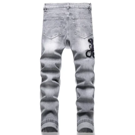 Men Snake Embroidery Gray Denim Jeans Streetwear Holes Ripped Stretch Pants Slim Straight Trousers