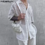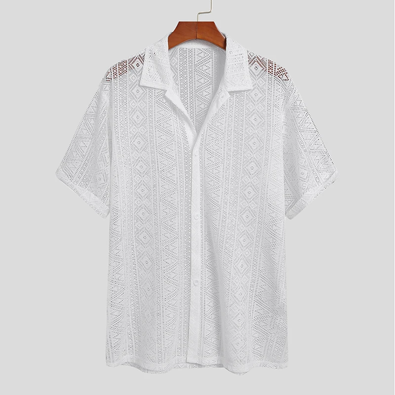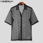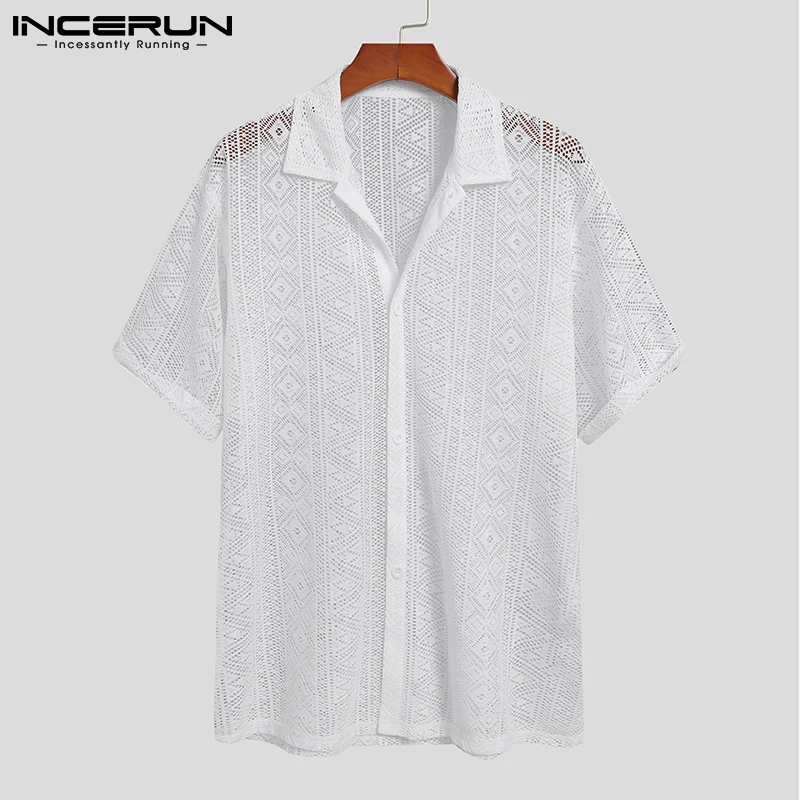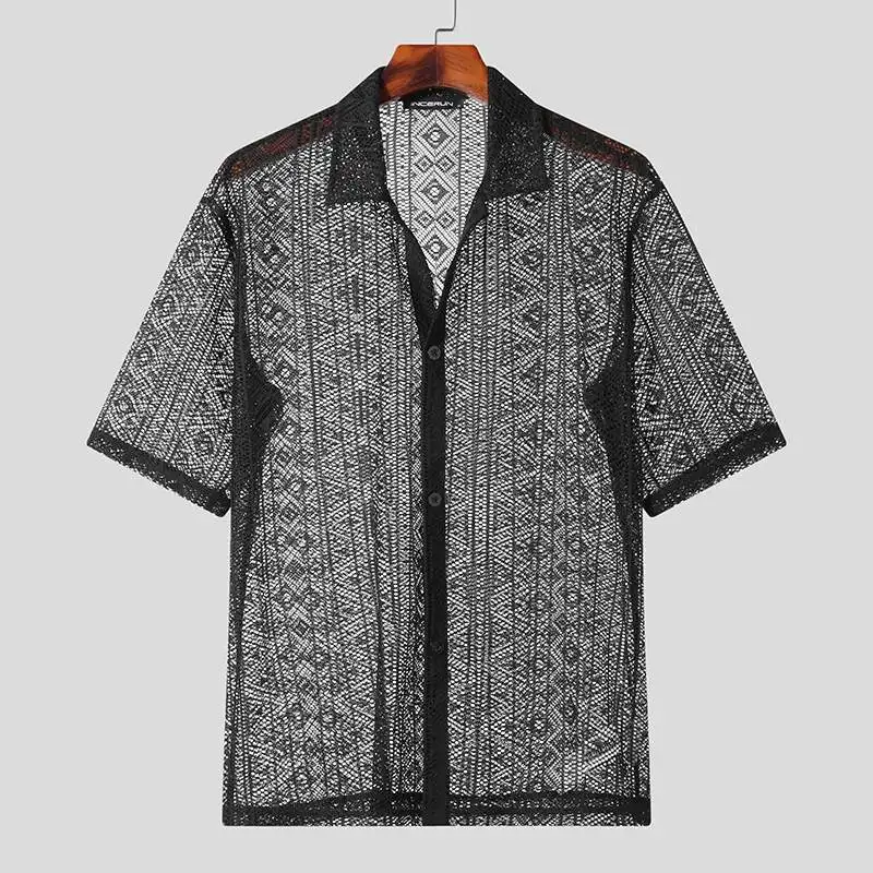 2023 Fashion Men Shirt Mesh Lace Transparent Streetwear Lapel Short Sleeve Button Camisas Party Sexy Men Clothing S-5XL INCERUN