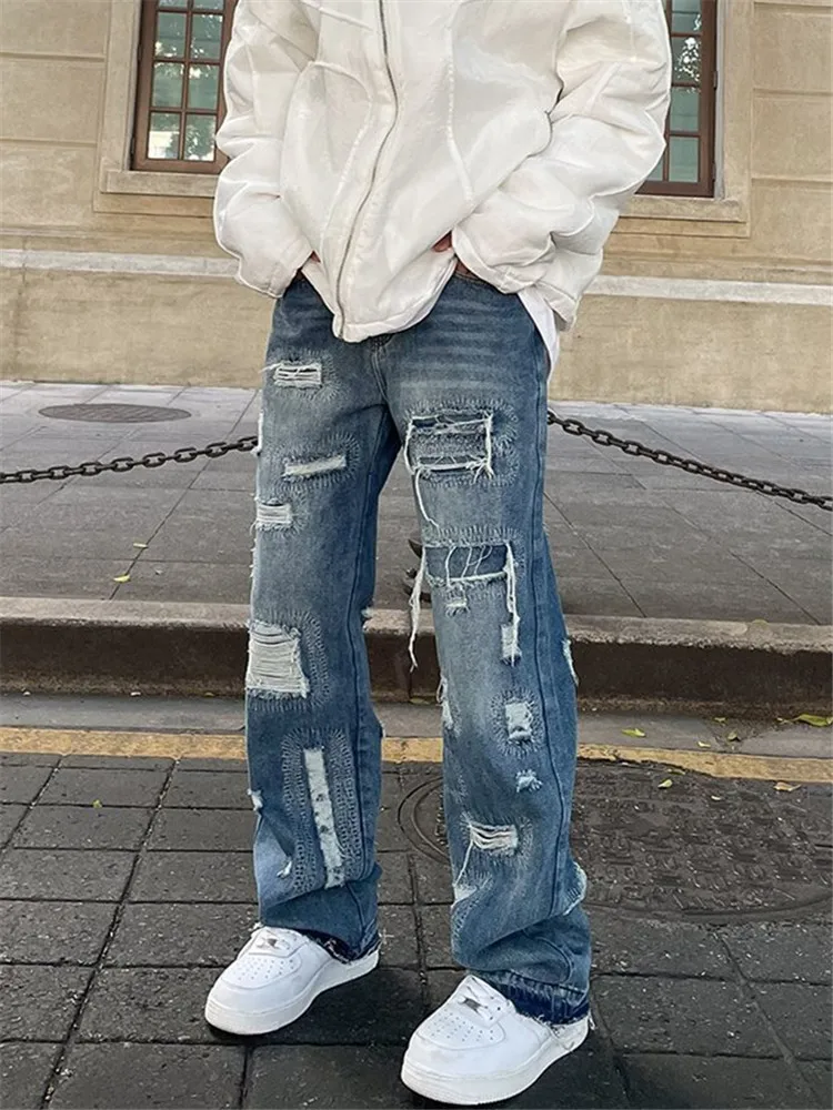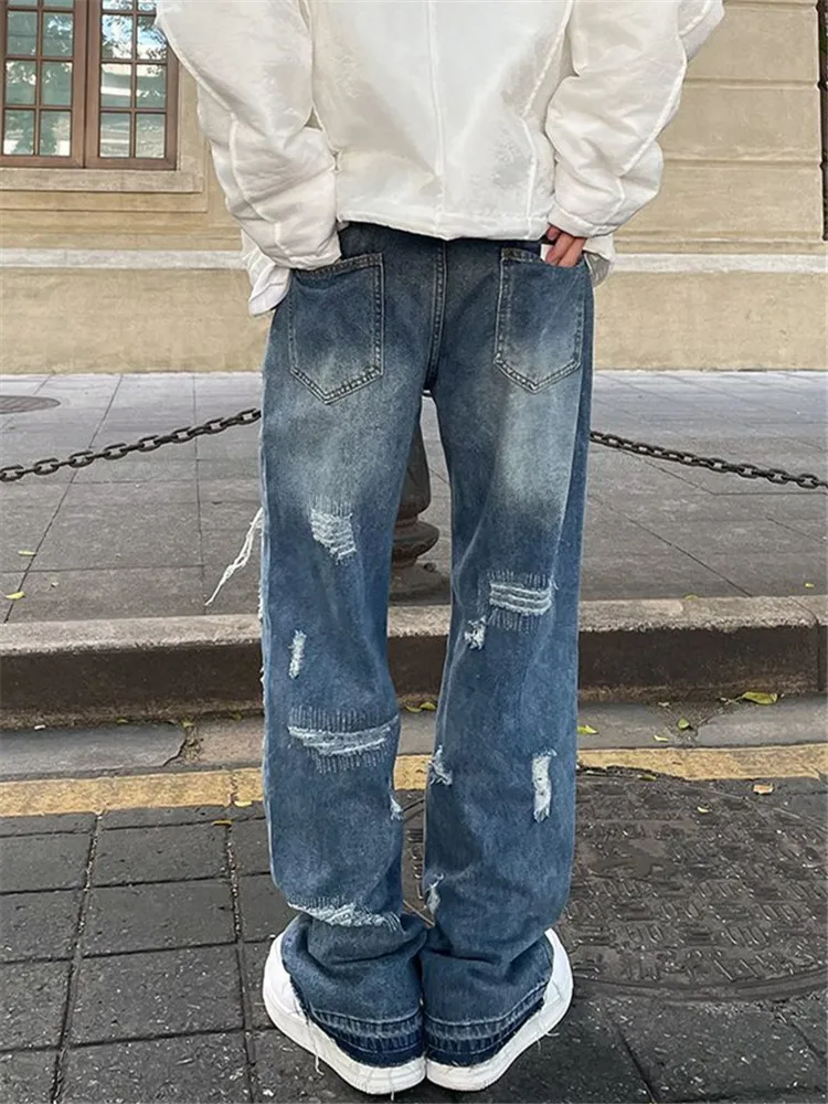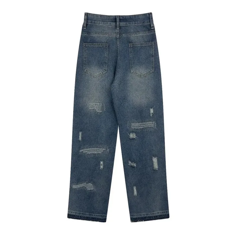 Blue High Street Jeans Men’s Solid Color Hole Do Old Straight Leg Pants Loose Button Pockets Y2K Trousers A170