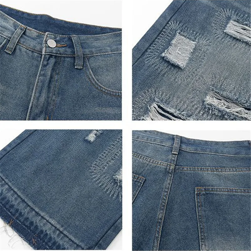 New High-Streets Summer Slim Denim Shorts for Men with Distressed Ripped Embroidered Cat Whiskers Hip Hop Streetwear Short Pants