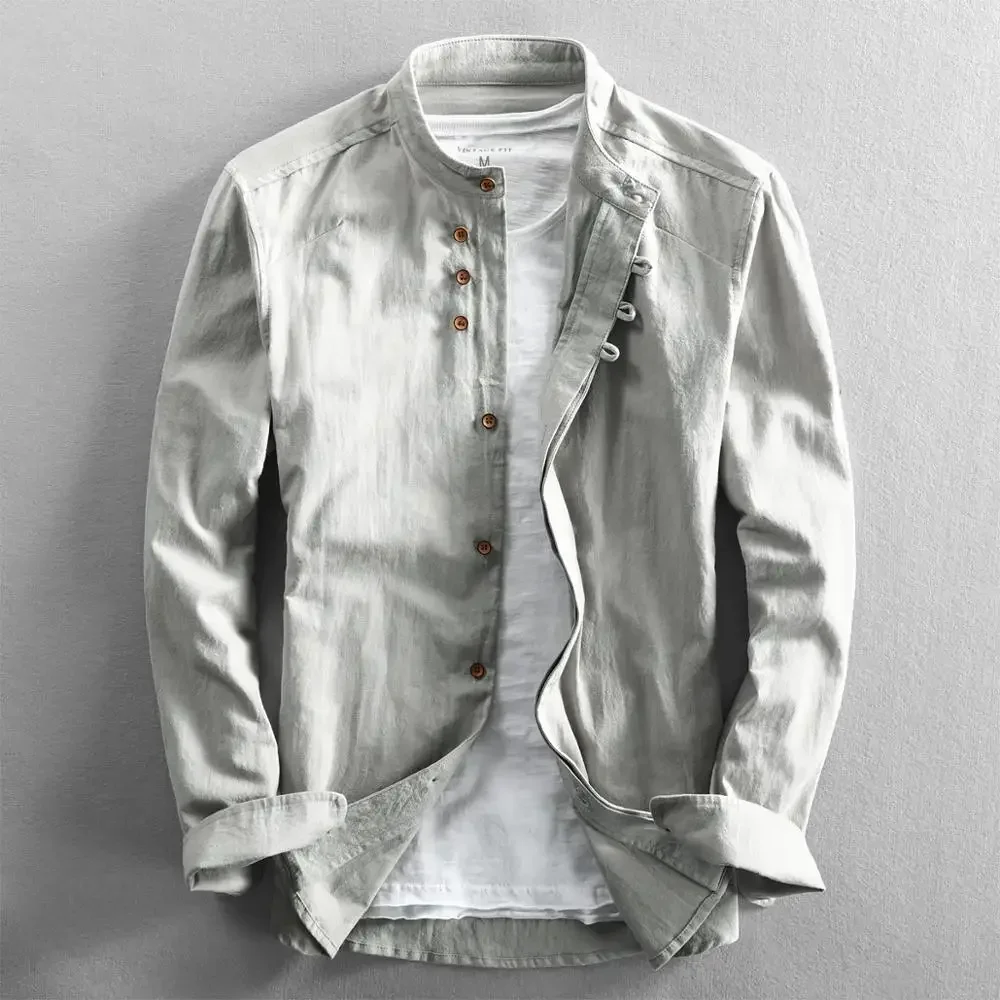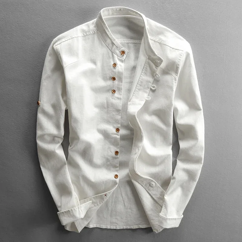Customizable Men Cotton Linen Shirt Formal Retro Chinese Style Long Sleeve Mandarin Collar Casual Shirts Soft Comfort Clothing