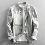 17oz Heavyweight Retro Casual Wear Men’s Shirt Coat Washed Denim Cargo Jeans Oversized Tops Vertical Stripped Long Sleeve Male