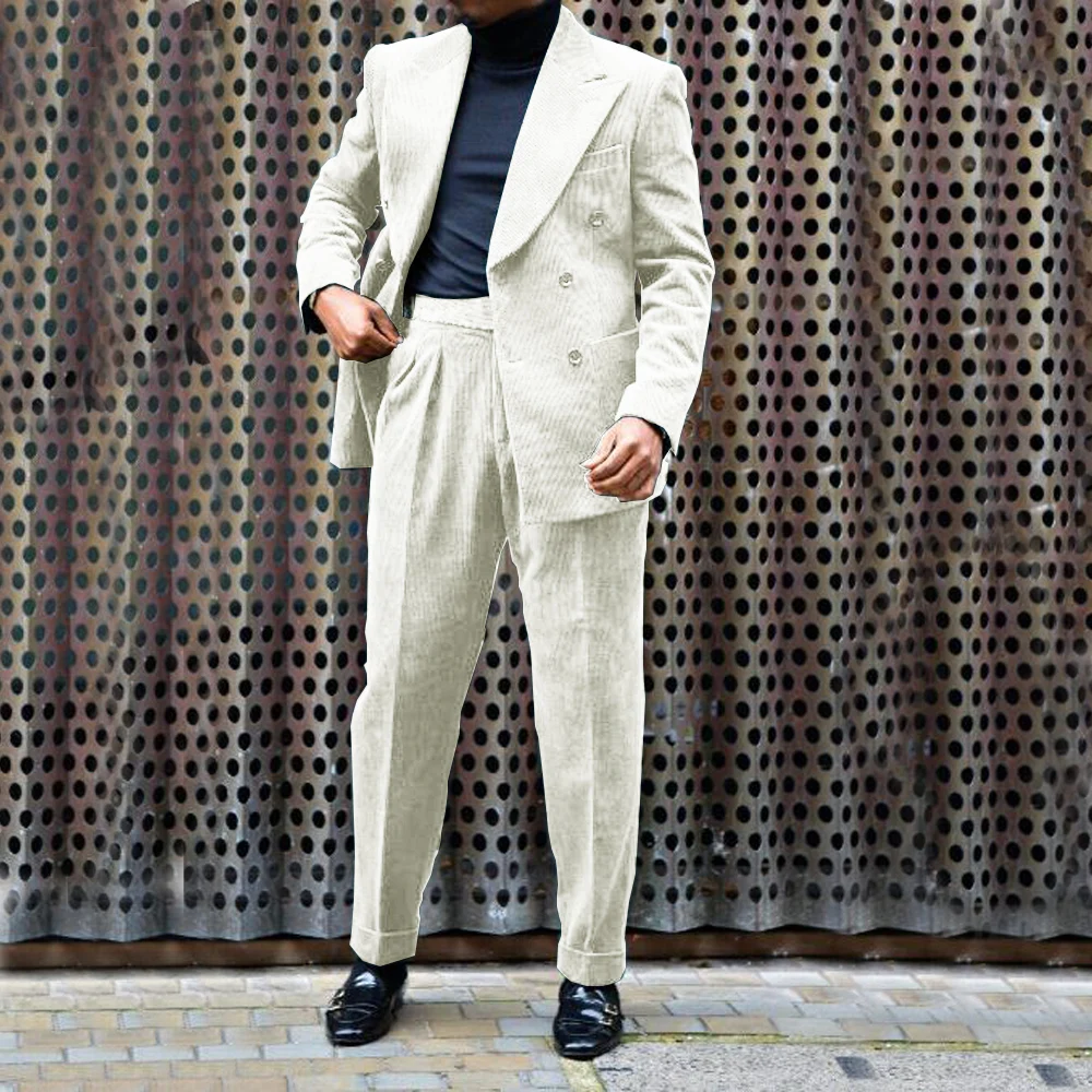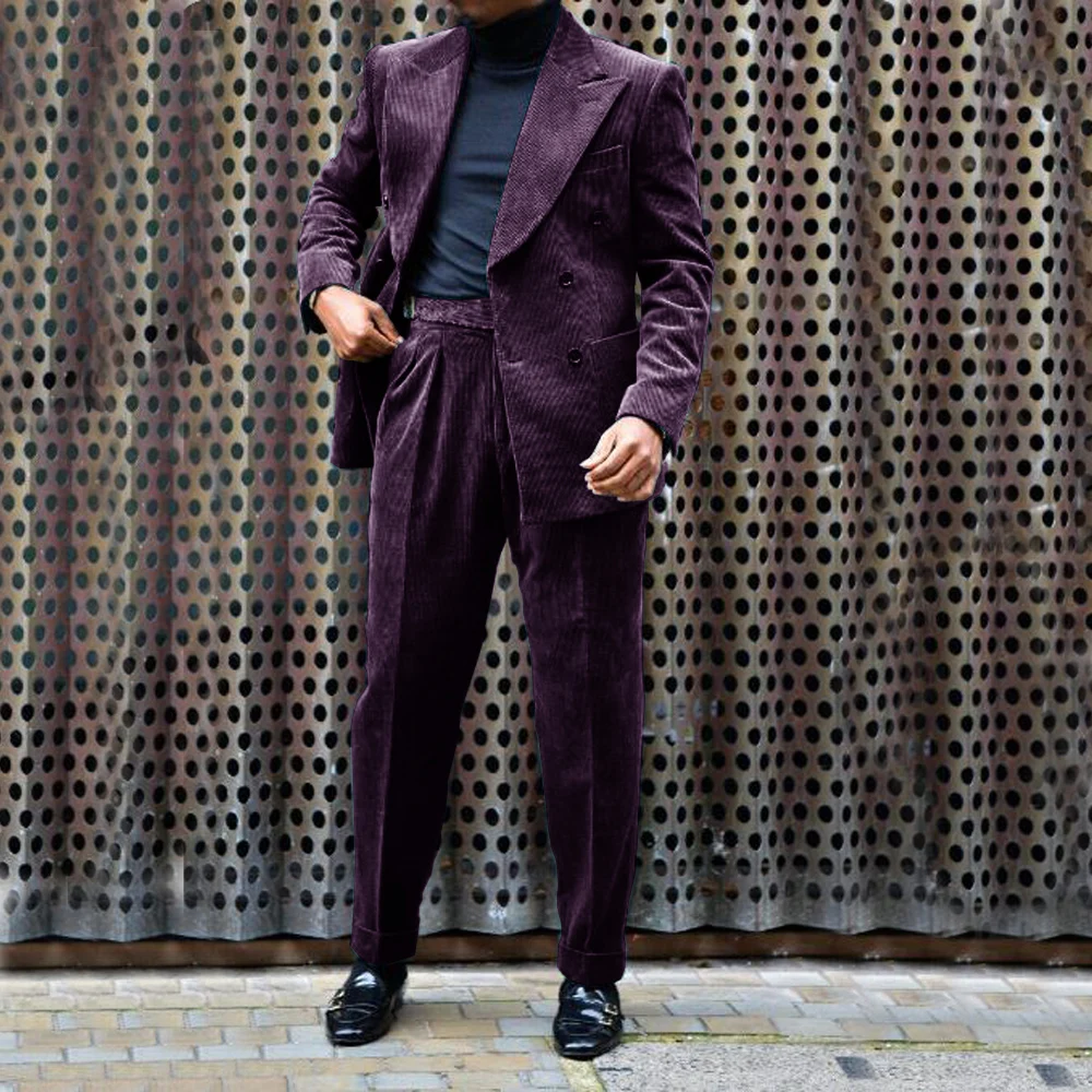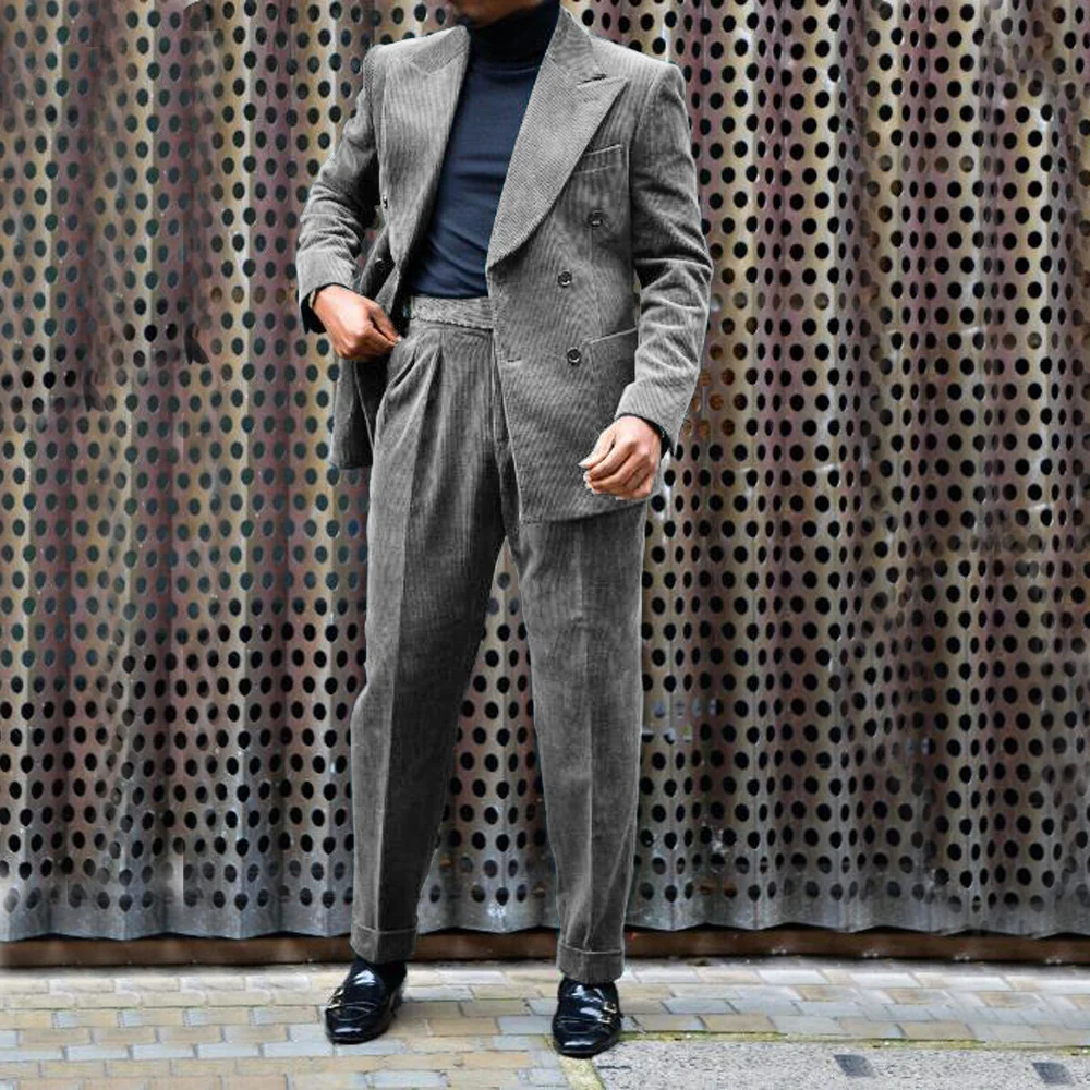 Men’s Corduroy Suit Double Breasted Gun Lapel 2 Piece Jacket + Pants Best Party Casual Men’s Wedding Outfit Full Suit