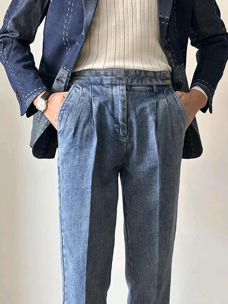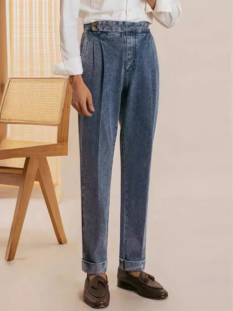 Naples Jean Trousers For Men 2024 Fall Trendy Solid Color Washed Denim Pants Mens Stylish Slim Fit Draped Design Straight Jeans