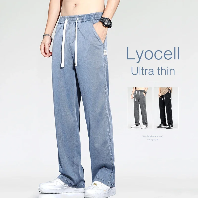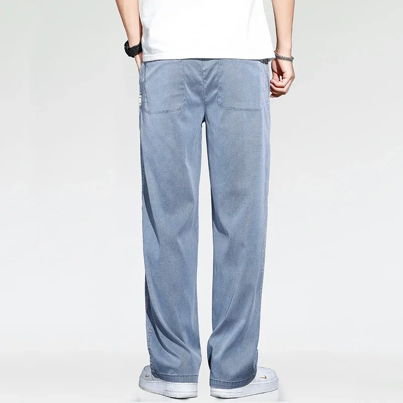 Ultra Thin Baggy Jeans Men's Summer New in Lyocell Soft Breathable Straight Trousers Elastic Waist Casual Blue Gray Wide Pants