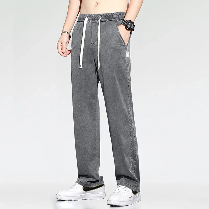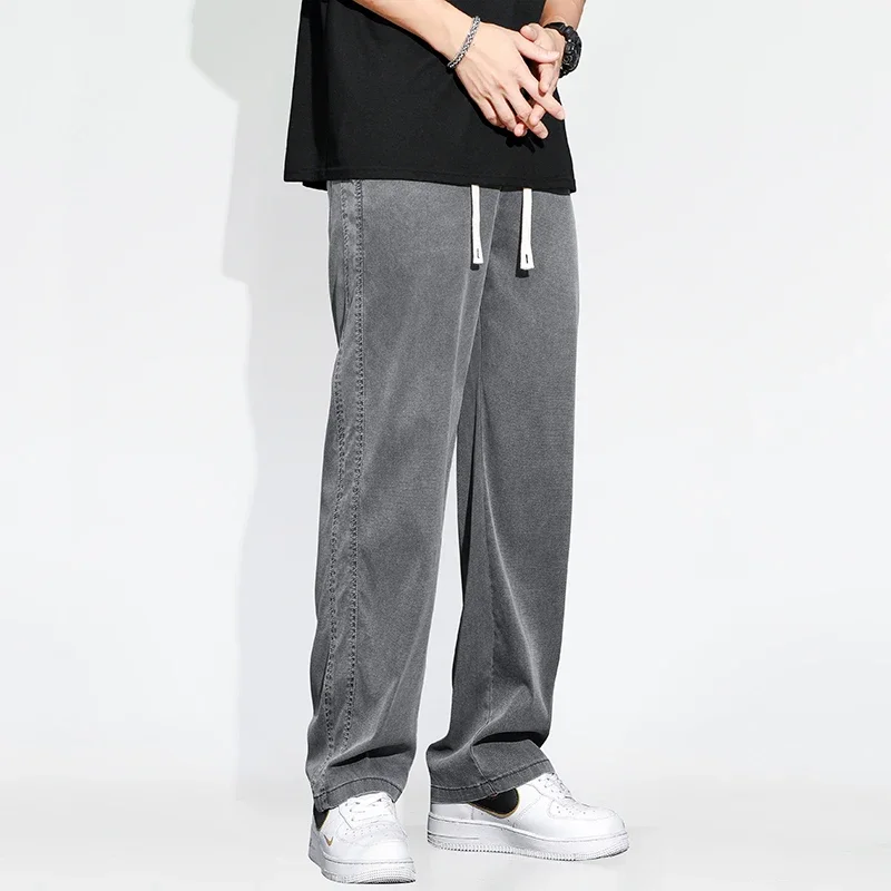 Summer Thin Loose Wide-leg Men Jeans Soft Lyocell Elastic Fashion Casual Straight Drawstring Denim Trousers Black Blue Gray