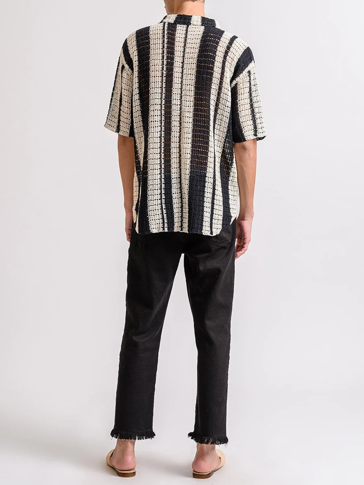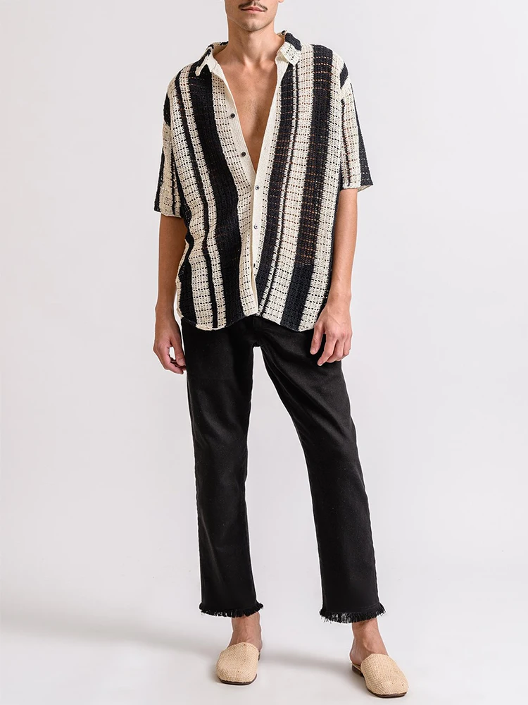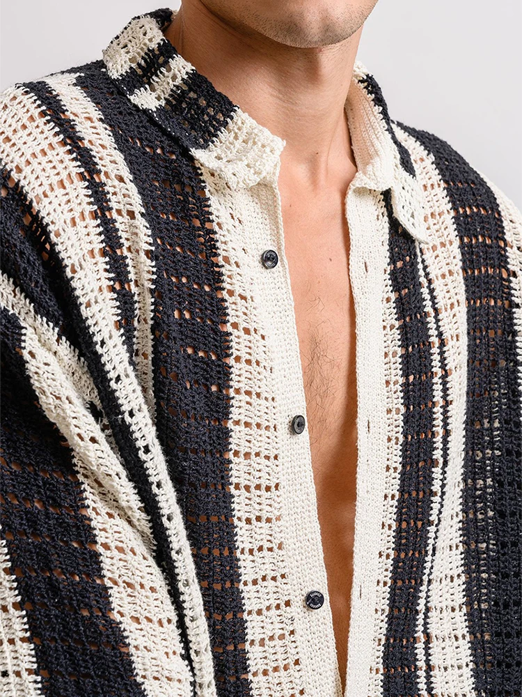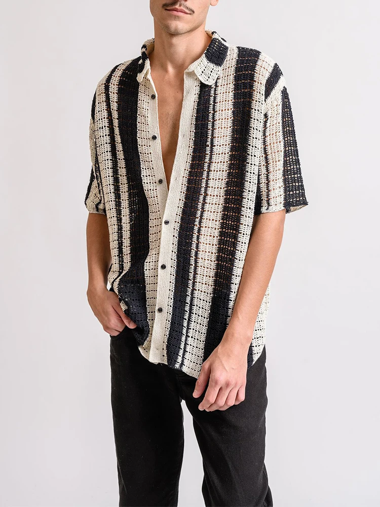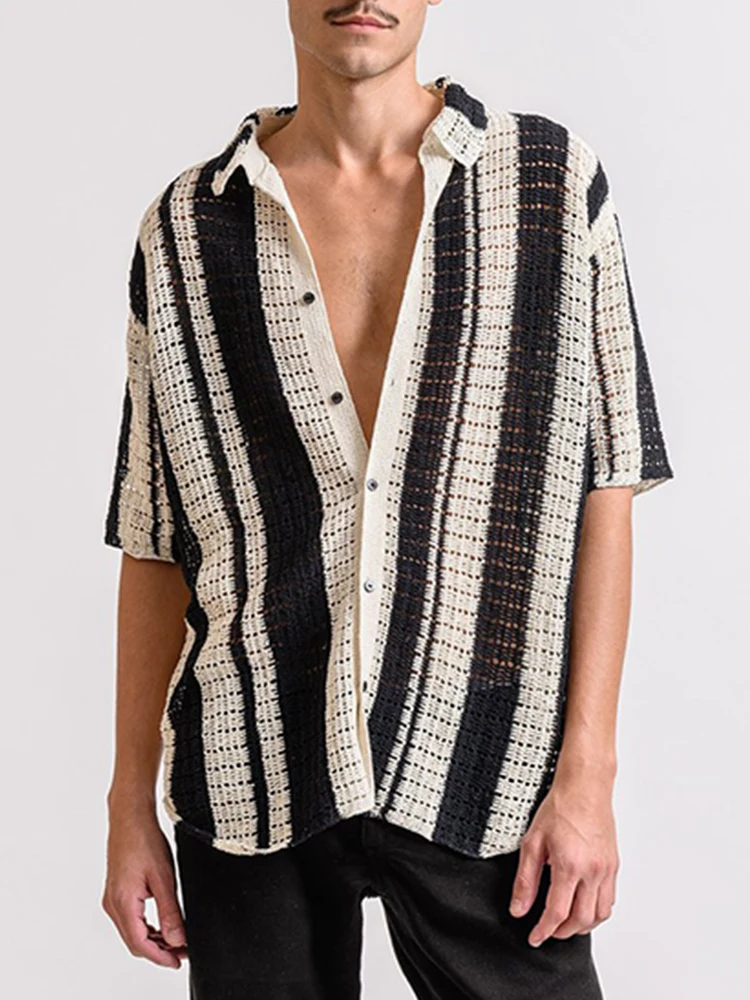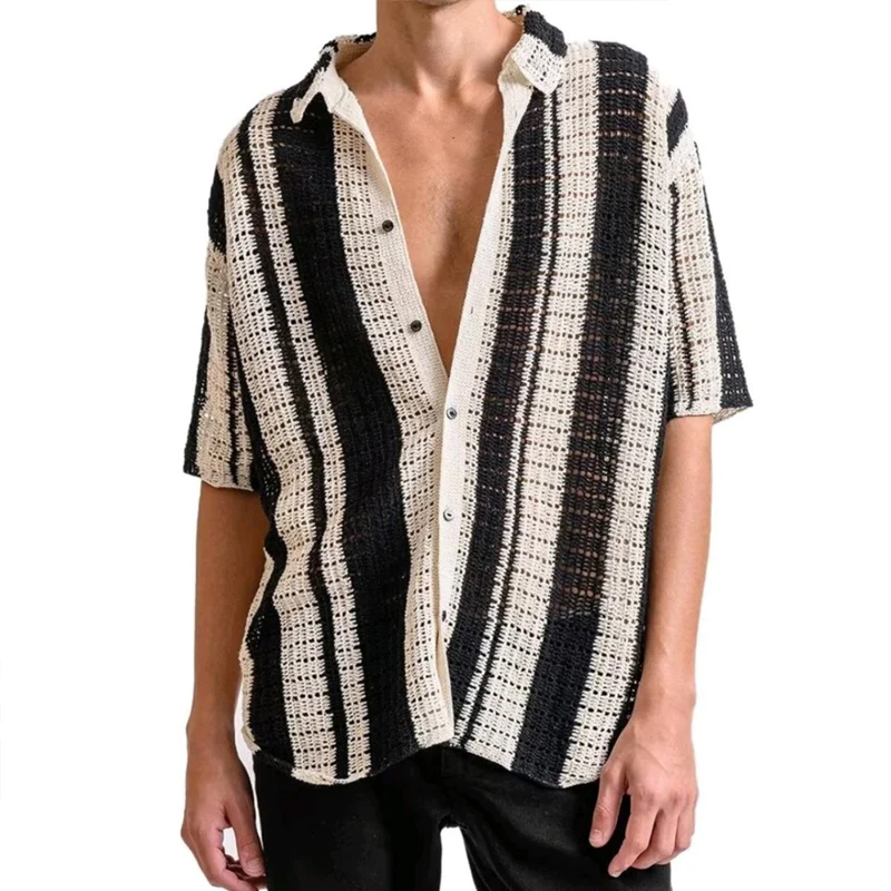 Vintage Striped Knitting Mens Shirt Summer Casual Breathable Hollow Out Knit Shirts Men Cardigan Short Sleeve Button Lapel Tops