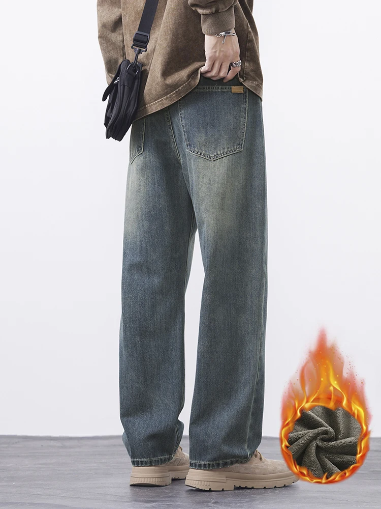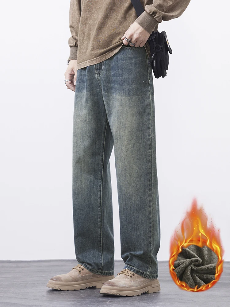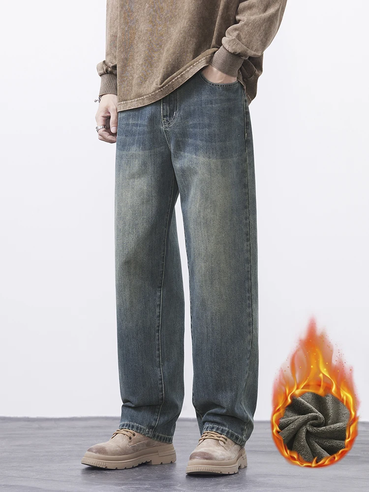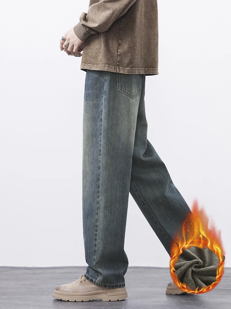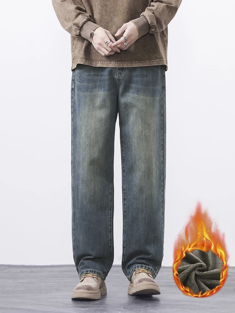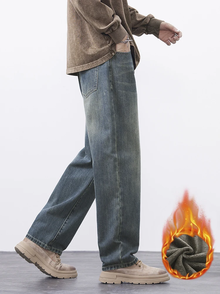Winter New Fleece Baggy Straight Jeans Men Fashion Korean Classic Wide Leg Denim Pants Thickened Warm Vintage Blue Male Trousers